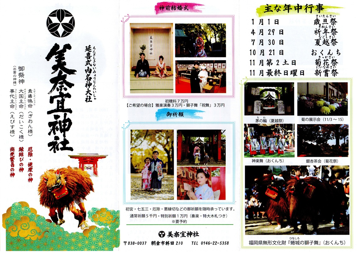 【主なる宝物】 美奈宜神社縁起、考証、御祭礼儀式帳、古刀二、軸二巻、寛文年以来古文書類、唐笛一管其他