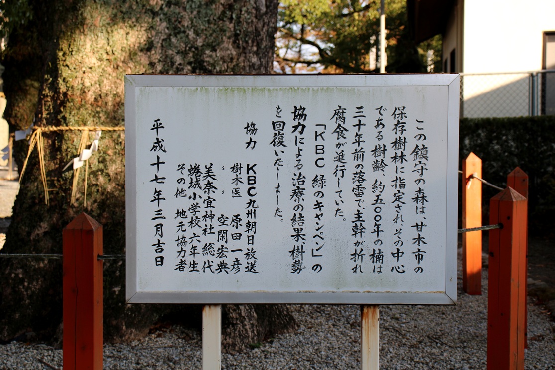 【由緒】 社記曰神功皇后摂政二年壬午創新祠於下座郡官郷内林田村為宮地延喜式巻九神名帳曰筑前国十九座下座郡三座(並大)美奈宜神社(名神大)社記曰神功皇后新羅を征し玉ふ時三神冥助あり云々凱旋の後三神を蜷城大明神と称して祭り玉ふ蜷の訓美奈とす故に仮字美奈宜とするは蜷城之和称なりと言ふ、皇后の御船肥前国高橋に着き玉ふ時ニ神垂跡の地云々下座総廟として祭祀す云々官郷と唱ふる地は永田八重津徳淵上畑中村鵜木片延林田八ケ村なり昔右八ケ村百三十町と言伝るは美奈宜御社領にして官郷ある絵縁由なるべし、宗像神社縁起文安元年副本曰皇后宜云々、熊襲討殺畢筑前州蜷城止申所是也倭漢三才図絵曰美奈宜神社下座郡在林田村祭神三座中間大己貴命、東素盞嗚命、西事代主命云々宝文六年丙午七月十二日神祇管領長(占部兼連)の裁許状曰筑前国下座郡林田村美奈宜大明神之祠官内藤主膳云々筑前続風土記十巻曰下座郡林田神社此社則延喜式所載筑前十九神の内三座美奈宜神社なりと昔より云伝ふ、延喜式に元より大社とある故昔此宮所の境内方九町余りと雖とも今は田になりて其堺地広からす古の総門は上畑村に在しと云ふ今猶其名のみ残り又総門矢倉下杉馬場郷の橋、官郷等名残れり又神社より三丁ばかり隔て鳥居の立し跡あり秋月長門守の時迄は寄附の神領三十丁ありしと言ふ神庫に蔵める美奈宜神社考証曰延喜式神名帳載筑前国下座郡美奈宜神社(名神大)今考斯社地在下座林田村所祭之神則三座中殿大己貴命東殿素盞嗚尊西殿事代主也同郡荷原村有栗尾大明神社其所祭神神功皇后住吉大神武内大臣也、或云春日大明神、天照大神也其説混淆難一定今世属太平人文越開挙世知尊神明特於式内之神社厚加崇敬於是乎栗尾神社則美奈宜神社也以其隣干三奈木村之地有此説然而彼社本来不在三奈木村之地而在荷原村境内且為蜷城大明神之摂社則不為美奈宜神社也明矣水城本是郷名後世誤称美奈宜(有社伝之秘説)林田村之辺水城郷也永田村有水城渡可為証又林田村之辺称官郷是後世之所称而非古来之本名源順和名抄以無官郷可知而巳亦三城郷三奈木之村則郡与村同名者諸国往々有焉独於吾筑州訝之哉神功皇后将征三韓之時有事代主神託告之事見干曰日本書紀美奈宜神社家説云斯神冥助神后而令征三韓其説良有以也且神后集蜷為城偽誘熊襲而討之故有蜷城之和称也況神祇秘抄有美奈宜神社祭事代主命之文則堪為明験誰其疑之哉以故古来称此社為蜷城神社又通呼為美奈宜神社永正六年秋月氏大蔵朝臣種時之所寄進神像後板銘有蜷城大明神号則振古以此社為蜷城神社也明矣曩歳邦君源姓黒田氏光之(時賜松平氏)命令綴輯筑州続風土記之曰使貝原好古村山正知経歴郡村考定事実三人相議以当社為美奈宜之神社以古来所称無訛旧記所載有明験也今年自将軍家令諸国献方域図好古亦預其事以当社益為筑前十一社式内之美奈宜神社載之於図中然則後来有誰誣之哉三代実録云清和天皇貞観元年正月二十七日従五位下美奈宜神授従五位上可見往古朝家之尊崇越干他社社家者之伝説神徳之厳重載在社記今亦不贅筑前他志存疑曰末永虚舟著述ふ筑前早鑑に栗尾社を式内美奈宜神とするは偶々失考せるものなり筑陽記(安見有定著)美奈宜神社林田村にあり云々宝暦元年辛未筑前国主松平筑前守続高より領内郡総社を定む、下座郡は林田村美奈宜神社を総社とす、元禄縁起(洛陽吉田定俊著述)曰昔は神田百三十町ありしなり筑後国竹野郡恵利三本木朝帰床島鳥買高食千原西原の八ケ村当社を氏神として四季之神事を主る元禄の此迄は恵利村下宮へ神幸ありしが其後絶ぬ云々三瀦郡の畝田の字に美奈宜田など今に伝ふ小早川秀秋神領没収云々、此社古来下座郡総社とす就中敷地三十一ケ村より九月神事を営み明治維新の初め福岡藩庁より詮議を以て筑前国内にて延喜式所載之神社に御供米寄附し奉祀神官を士籍に列す則ち林田村美奈宜神社に米十俵寄附神職j内藤範胤